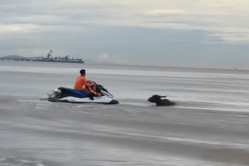 Một đàn trâu bị lũ cuốn trôi ra biển Cửa Lò có dấu hiệu kiệt sức, lực lượng chức năng ở tỉnh Nghệ An đã dùng thuyền máy giải cứu thành công, đưa trâu vào bờ an toàn.